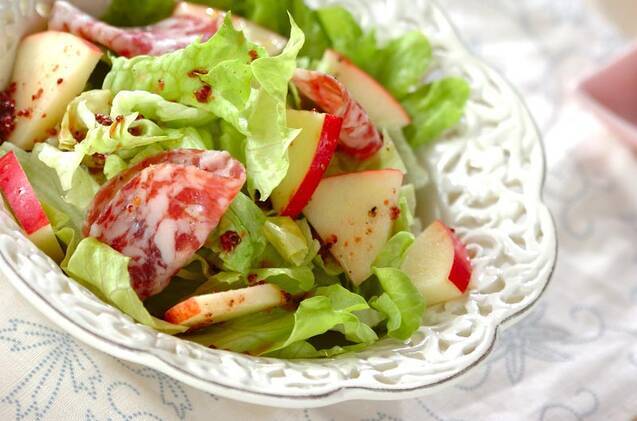 1つ目のアレンジレシピは、リンゴの甘さとサラミの程よい塩気が相性抜群のサラミとリンゴのサラダです。