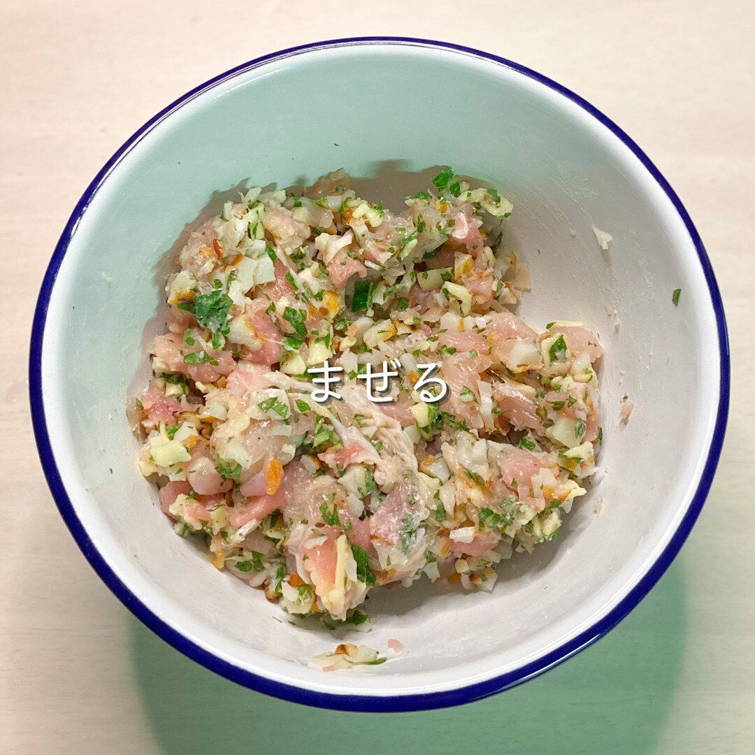 2-3cm角に切った鶏肉、塩ふたつまみ、胡椒、片栗粉を合わせても見込んだ後、刻んだちくわと大葉、チーズをいれます。