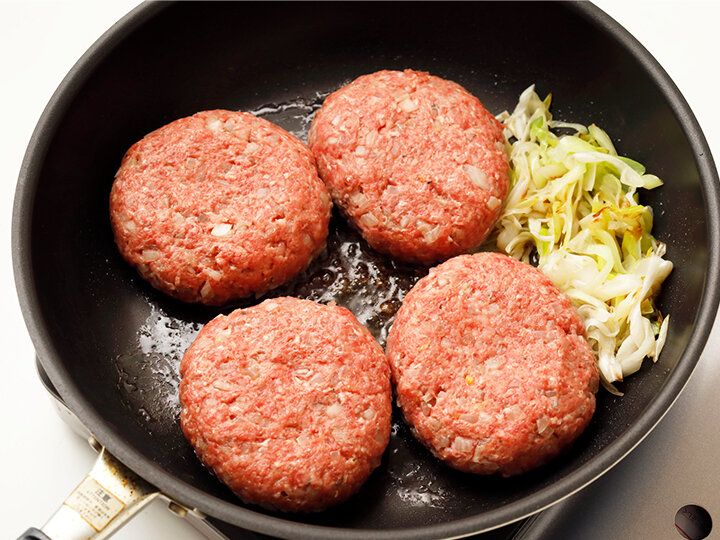 3.ボウルに合いびき肉と2を入れて、粘り気が出るまでよく混ぜ合わせる。4等分して成形する