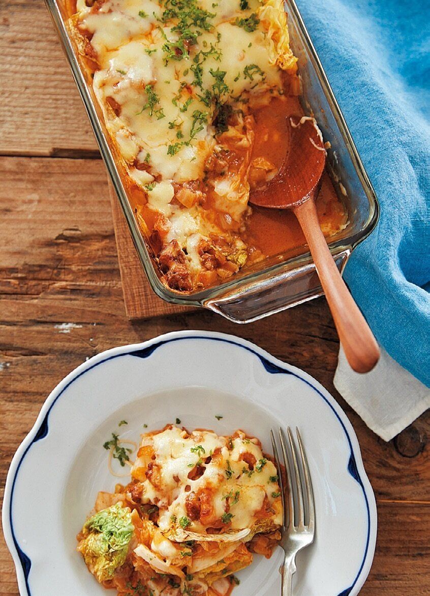 耐熱容器にざく切りの白菜、炒めたひき肉、ピザ用チーズの順に半量ずつ6段重ね入れ、170℃のオーブンで10分焼き、あればパセリをふる。(ぐっち夫婦)