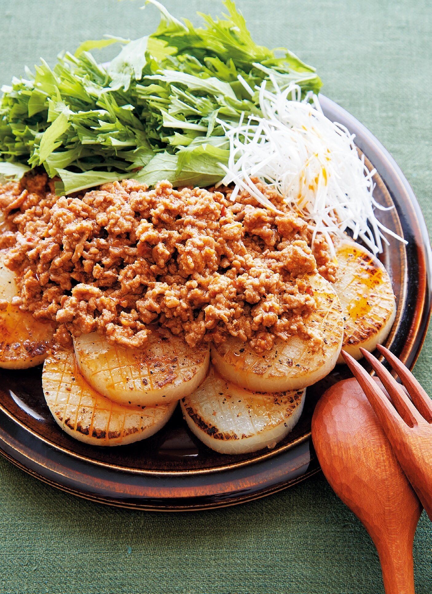 (2)のフライパンにサラダ油大さじ1/2をたして中火で熱し、ひき肉を炒め、色が変わったら[A]を混ぜて加え、炒める。(2)にかけ、水菜、しらがねぎを添え、ラー油をかける。(市瀬)