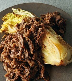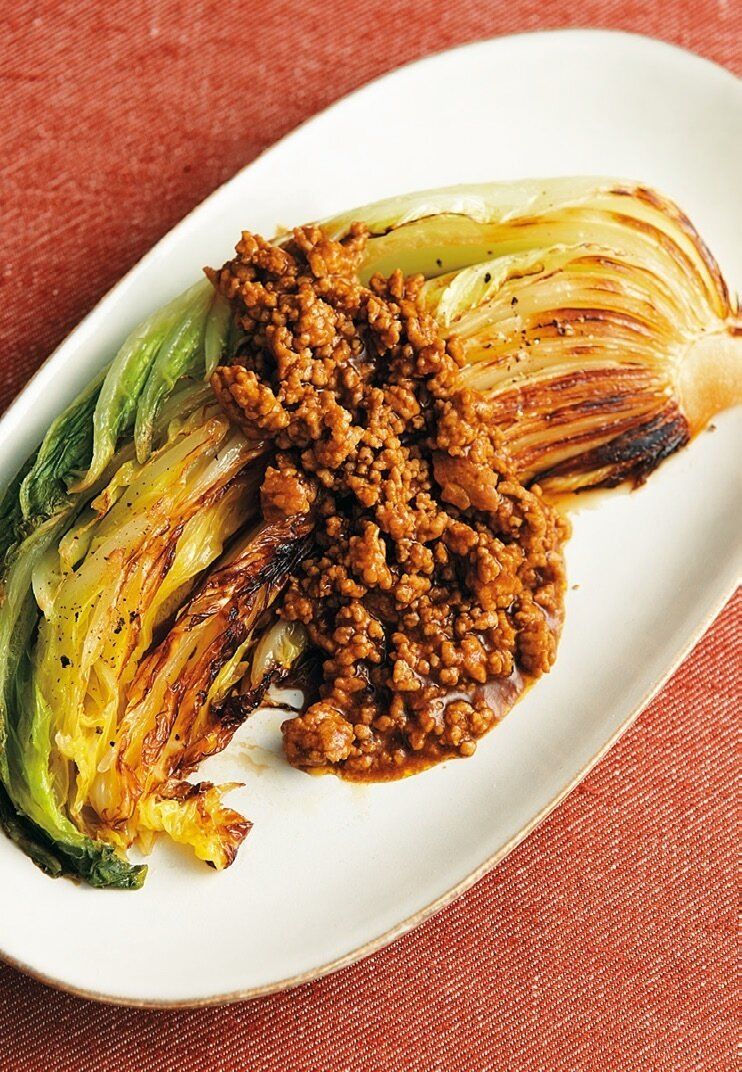 ざく切りにした白菜を耐熱皿に入れて塩をふり、ふんわりとラップを掛けて電子レンジで3分加熱し、水けをきる。オリーブ油でにんにく、ひき肉、粗みじん切りにした白菜を中火で炒め、[A]を入れて煮つめる。