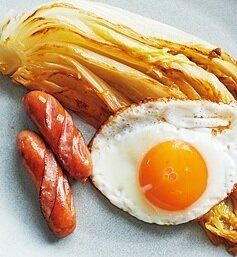 オリーブ油とにんにくで蒸し焼きにし、ウインナーと目玉焼きを添えて。