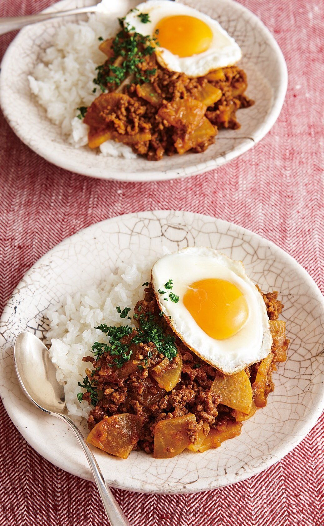 別のフライパンにサラダ油少々を中火で熱し、卵を割り入れ、好みの半熟加減の目玉焼きを焼く。器にご飯、(2)を盛り、目玉焼きをのせ、パセリをふる。