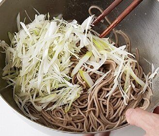ゆでたそばが熱いうちにねぎを混ぜる。余熱でねぎがしんなりして辛みがやわらぐ。