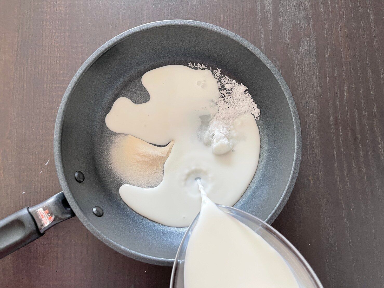 2.牛乳、粉寒天、砂糖をあわせて弱火にかけ、とろみがつくまで加熱する。