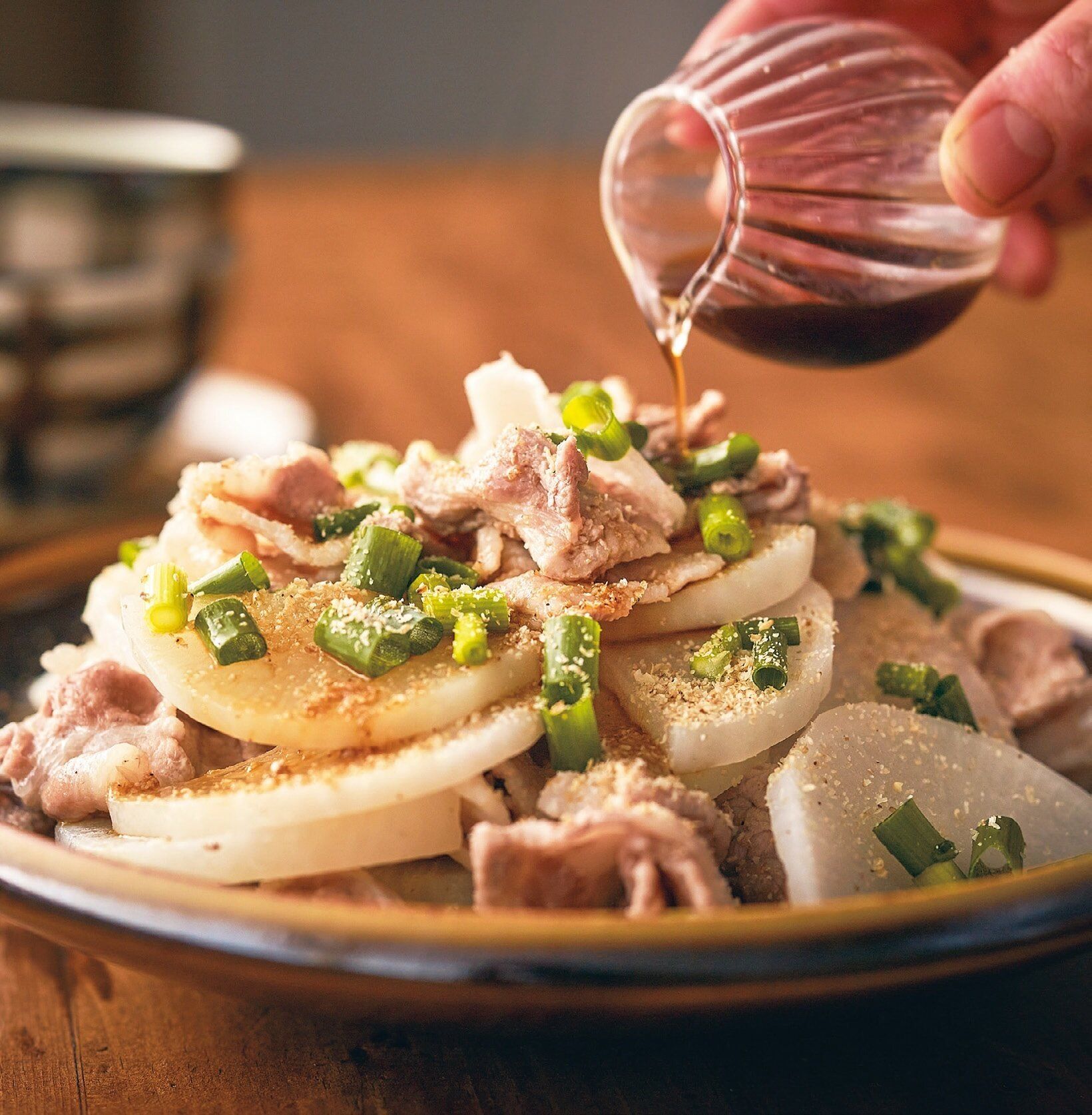 フライパンに豚肉と大根を交互に重ね入れてごま油をかけ、水1/3カップを加える。ふたをして中火にかけ、煮立ったら5~7分、大根に火が通るまで蒸し煮に。