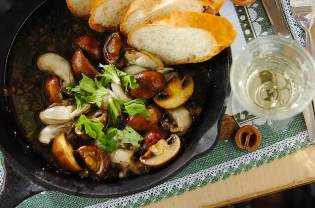 スキレットを使うことで、レストランで出てくるようなアヒージョを手軽に再現できます。牡蠣とマッシュルームのうま味が溶けだしたオイルは、バゲットとの相性も抜群です。