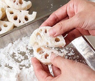 鶏肉だけでなくれんこんにも片栗粉をまぶす。揚げてからたれがからみやすくなる。