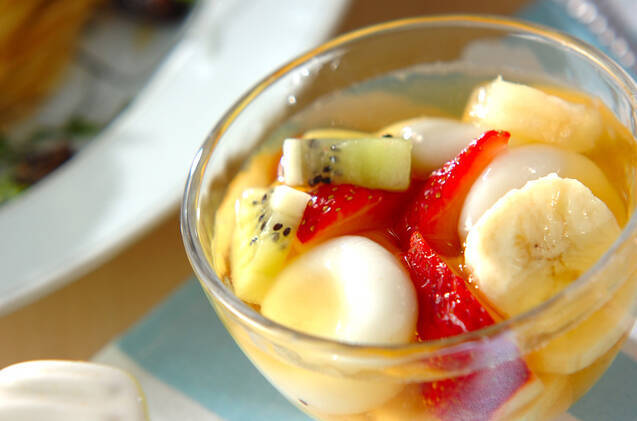 フルーツは缶詰などを使えば手軽に用意できるため、冷凍保存しておいた白玉団子を解凍すればすぐに楽しめるレシピです。