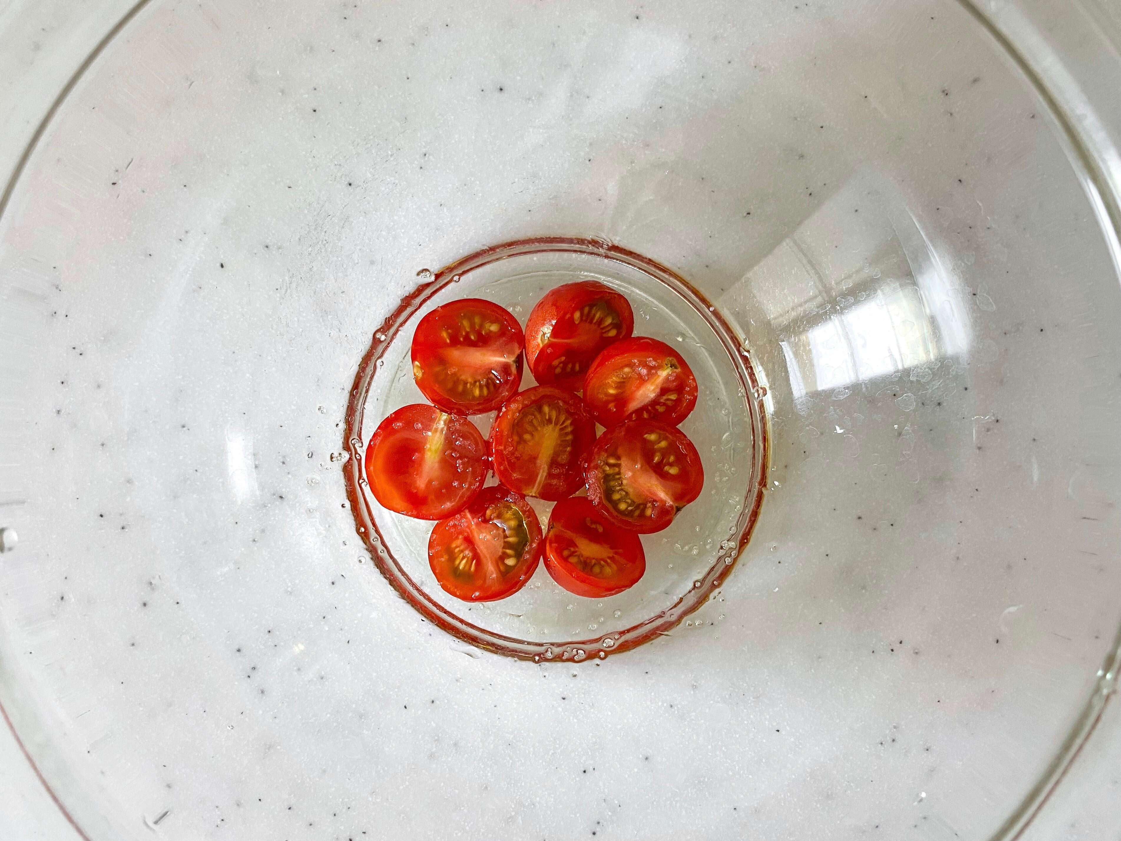 (1) ミニトマトは半分に切って耐熱ボウルに入れる。分量の塩のうち微量をふり、オリーブオイルをかけてラップをふんわりかける。600Wの電子レンジで1分加熱する。(以後すべてレンジは600W)