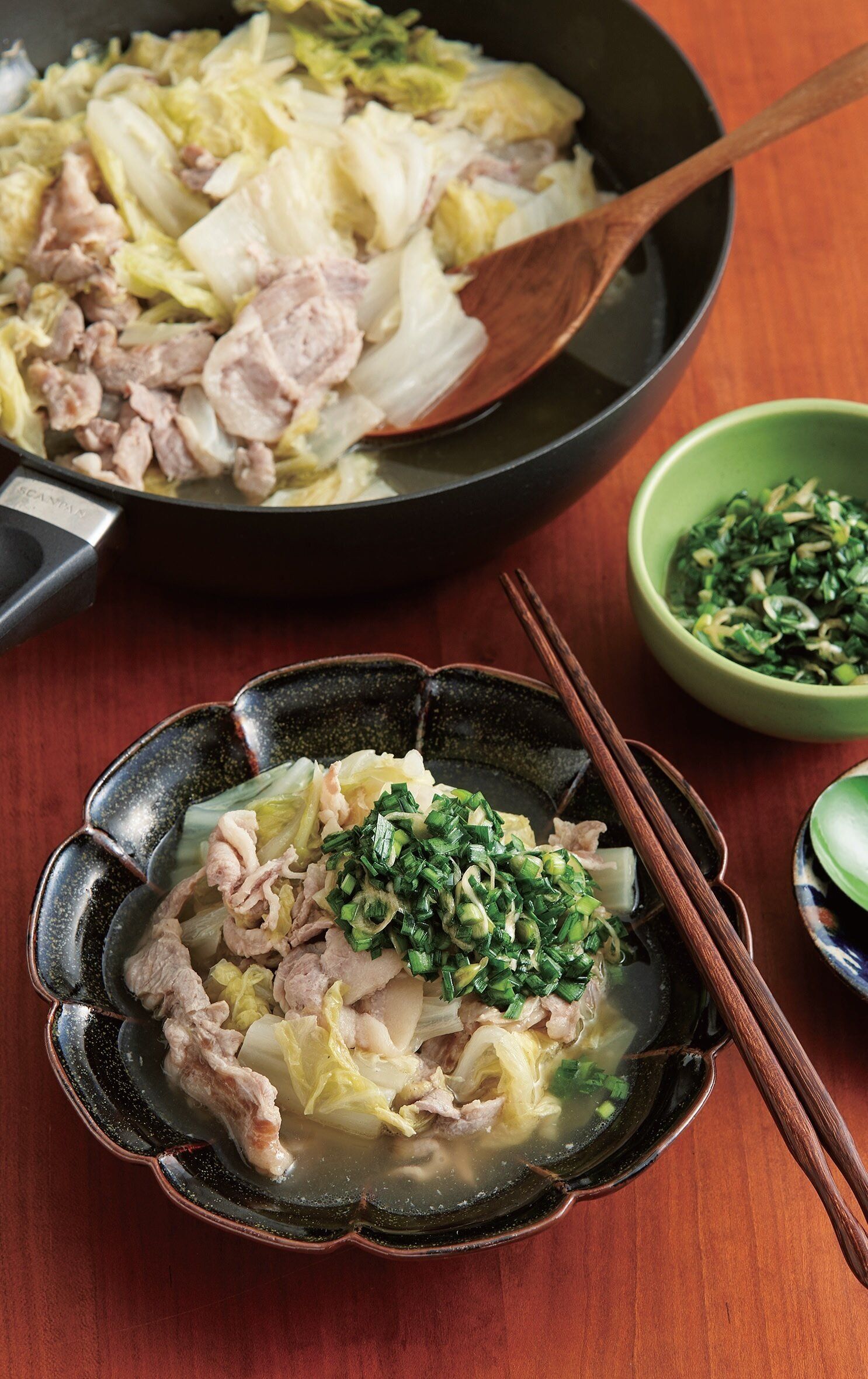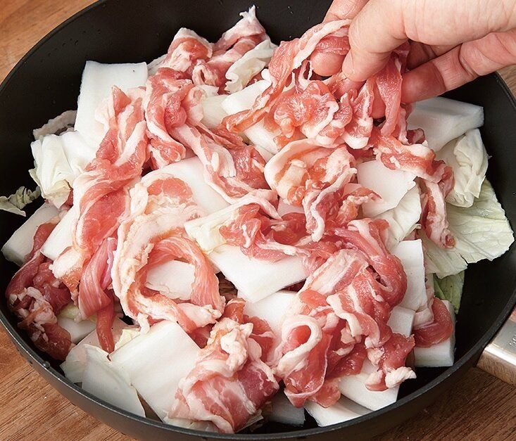 フライパンに、白菜の軸の部分の適量を広げて入れ、豚肉の1/3量~半量をのせる(広げなくてもいい)。その上に白菜の軸の残りと葉適量をのせ、さらに豚肉と白菜を交互に重ね入れる。最後に白菜の葉の残りをのせる。