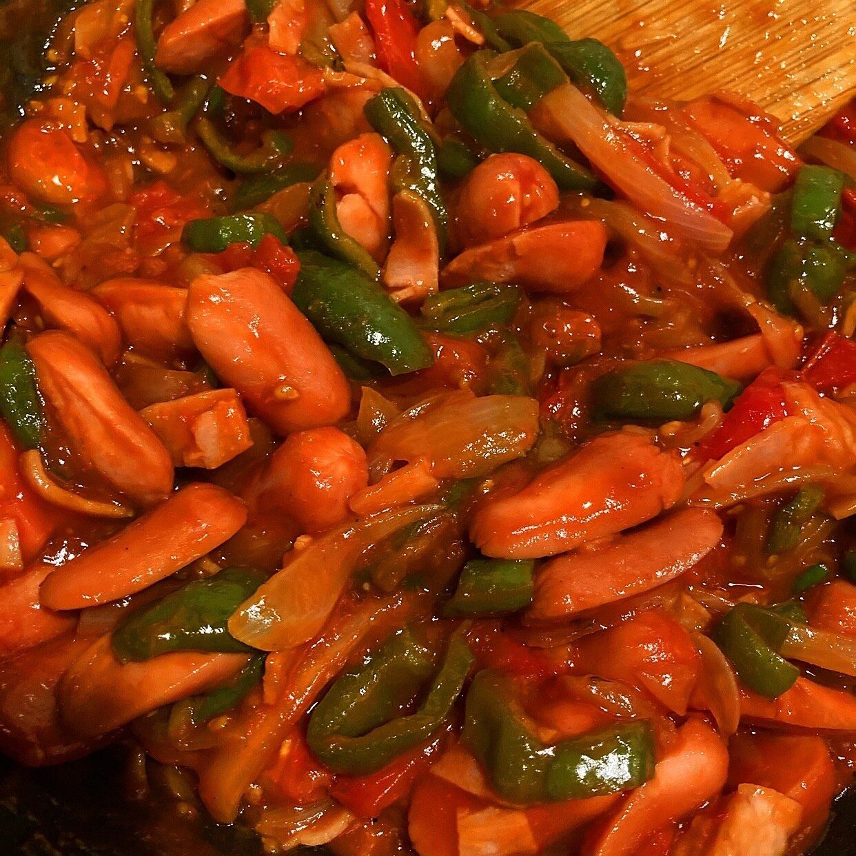 4.ピーマンを入れて(調味料)を加える。ケチャップの色が鮮やかになるまで少し煮立たせる。これで完成。
