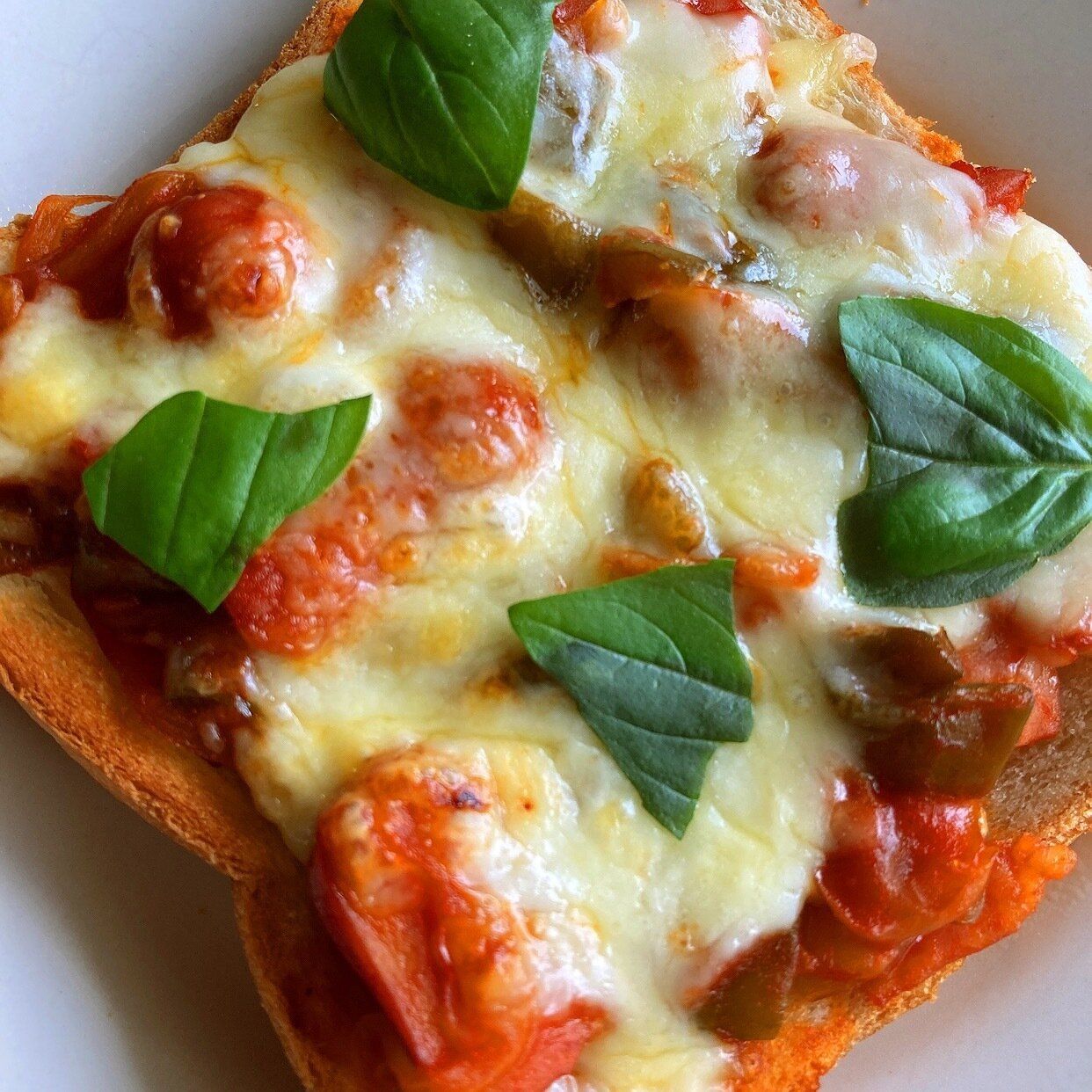 食パンにナポリタンの素を適量のせて、ピザ用チーズをたっぷりとのせたらトースターで加熱するだけ。