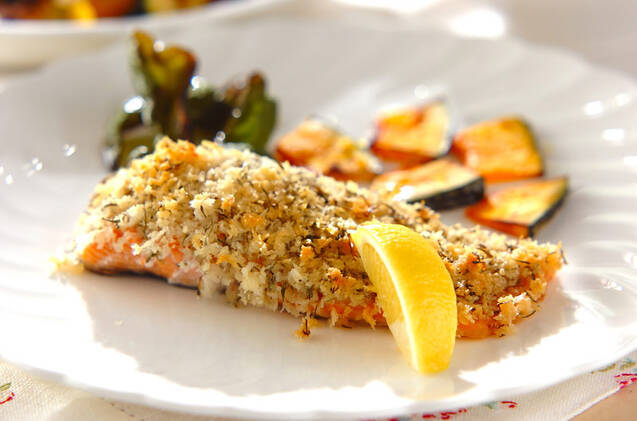 まず紹介するのがサーモンのパン粉焼きです。下味をつけたサーモン、食べやすい大きさにカットしたカボチャやピーマンなどを焼いていきます。自宅のオーブンによって焼き時間などに違いが出てくるため、注意が必要です。