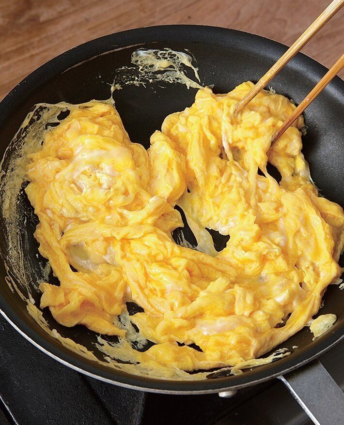 ボウルに卵、塩小さじ1/4を入れて溶きほぐす。フライパンをしっかり熱し、強めの中火にしてサラダ油を入れて熱し、溶き卵を一気に流し入れ、菜箸で大きく混ぜながら火を通し、半熟状になったらすぐに器に盛る。