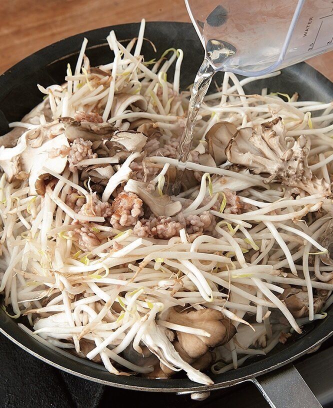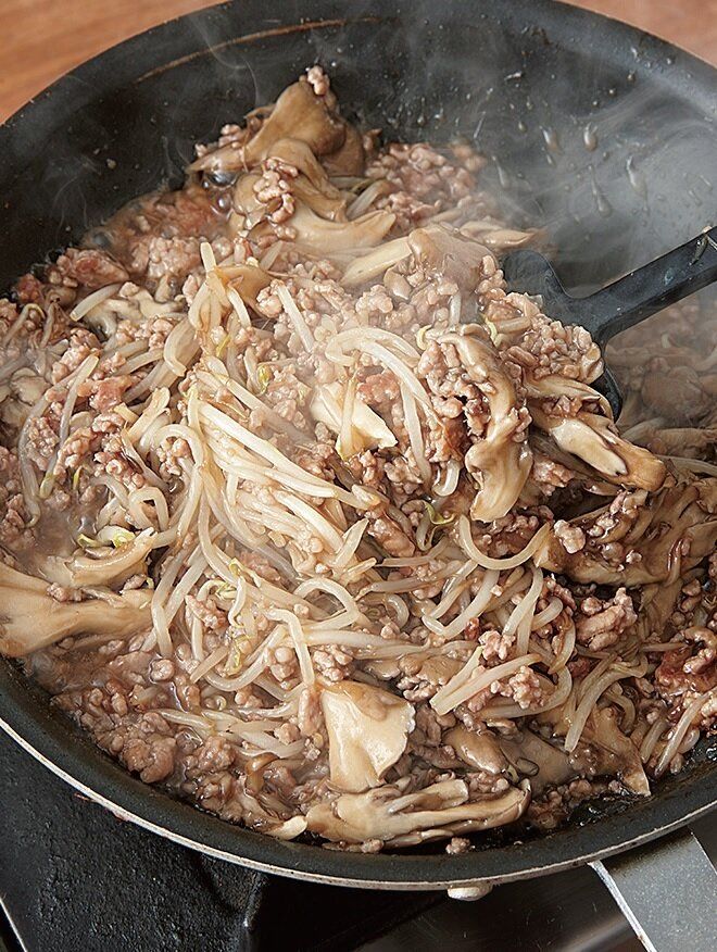 同じフライパンにひき肉を入れて広げ、片栗粉をふり、ほぐしながら肉の色がほぼ変わるまで強めの中火で炒める。もやしを入れ、まいたけをほぐして加え、ざっと混ぜる。