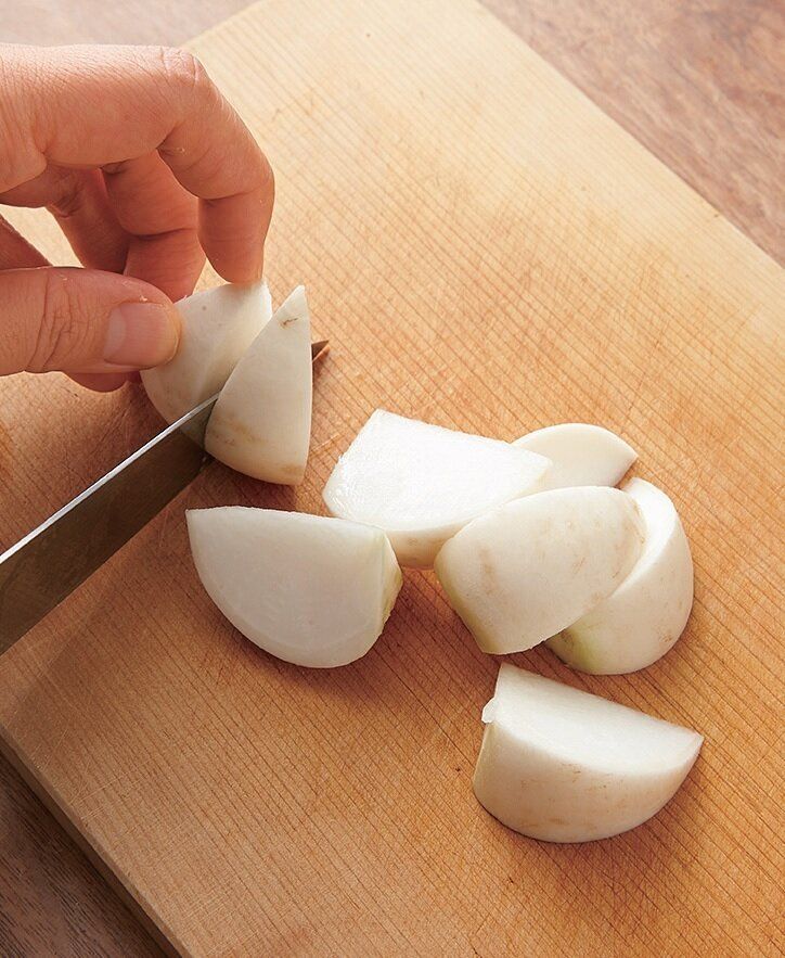 かぶは皮ごと8等分のくし形切りにする。葉は長さ3cmに切る。