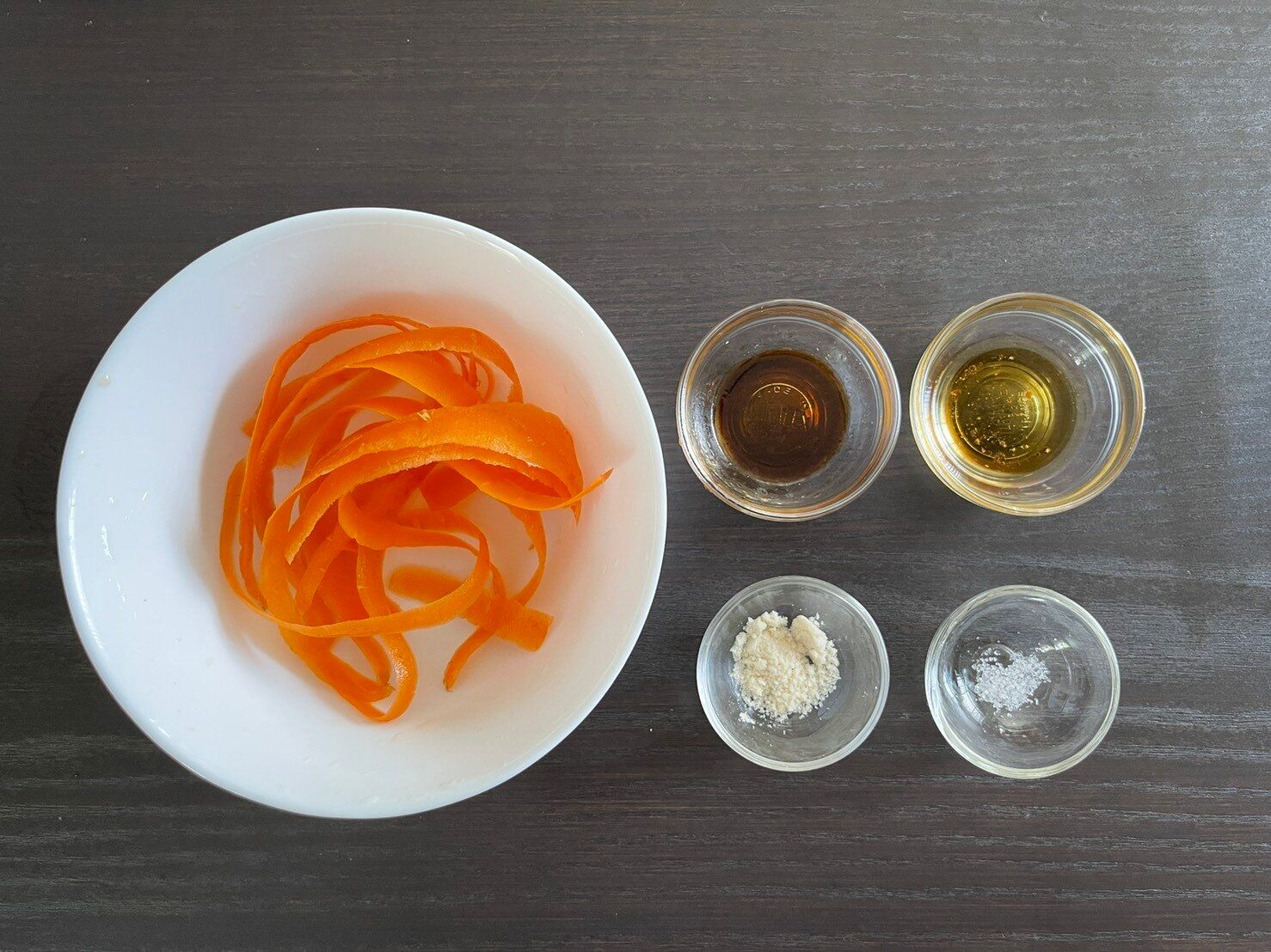 (1)にんじんの皮はごま油とともに強火で1分炒める。