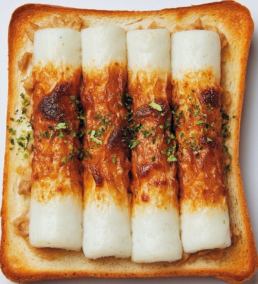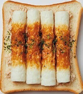 マヨネーズとツナを混ぜてパンにのせ、ちくわを並べて青のりを散らす。 プリプリ食感とツナのうまみがクセになりますよ!
