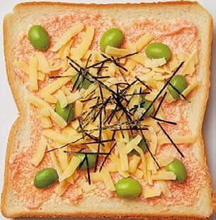 マヨネーズと明太子を混ぜてパンに塗り、枝豆とチーズをのせ、刻みのりを散らす。