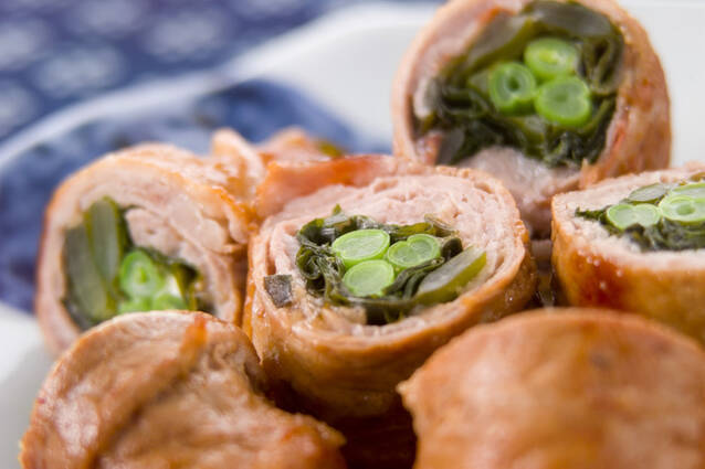 生わかめをメイン料理に使用したのが、豚肉巻きです。このレシピを作る際には、冷凍したわかめは熱湯をかけて解凍しておきましょう。