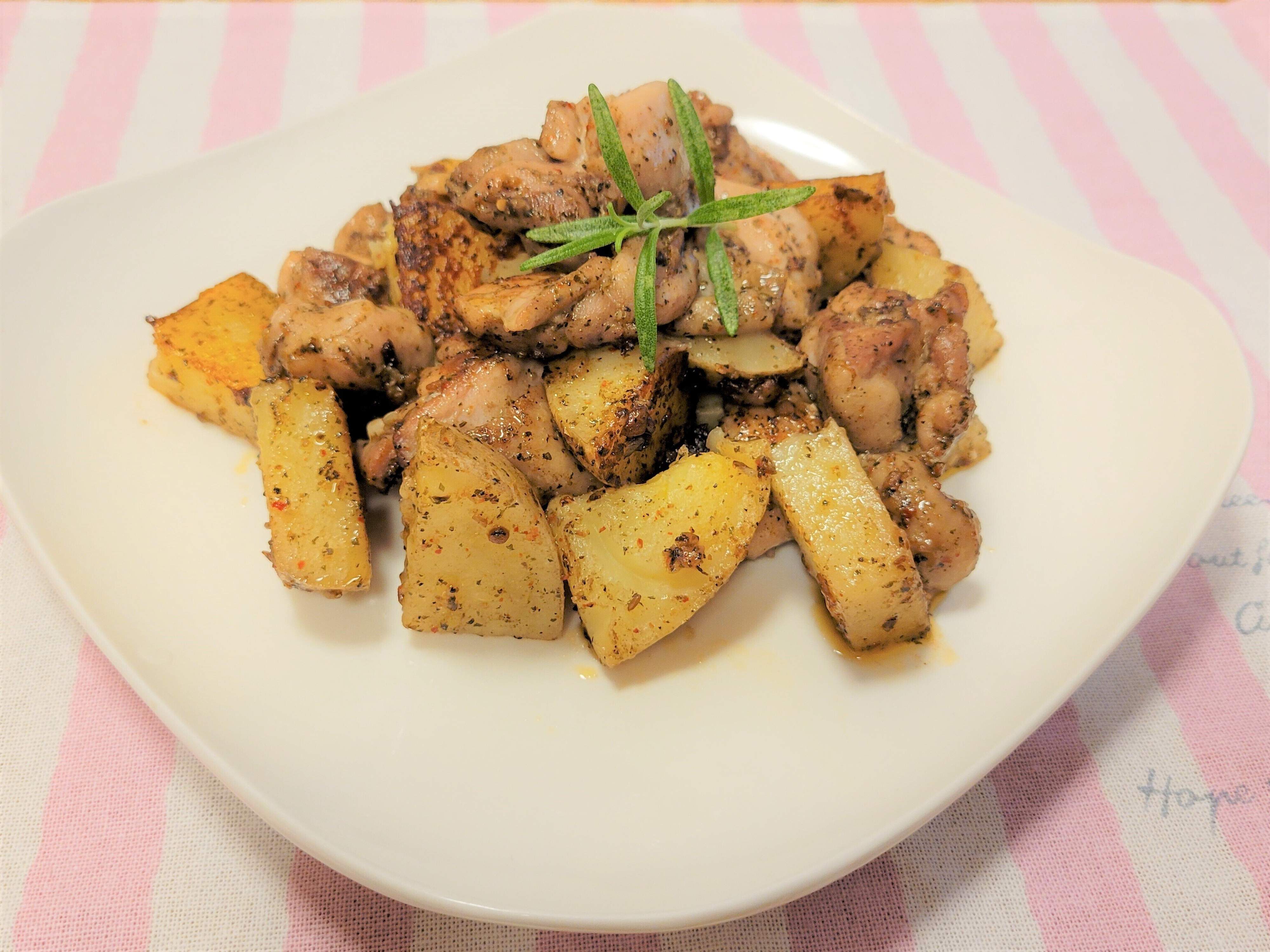 熱したオリーブオイルにスライスしたにんにくを入れて香りがでてきたところで、鶏もも肉とじゃがいもを入れて炒め、オレガノのジェノベーゼ風調味料とカレーパウダーで味付け。カレーとの相性もばっちりです。