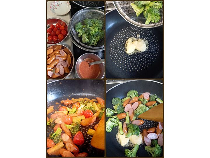 1.ブロッコリーは小房に分ける。ウインナーは4等分の斜め切りにする。