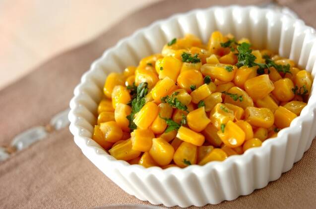 冷凍バターとコーンを炒めて味付けをすれば完成です。簡単に1品できるので試してみましょう。盛り付け時にさらにバターをのせてもおいしく食べられます。