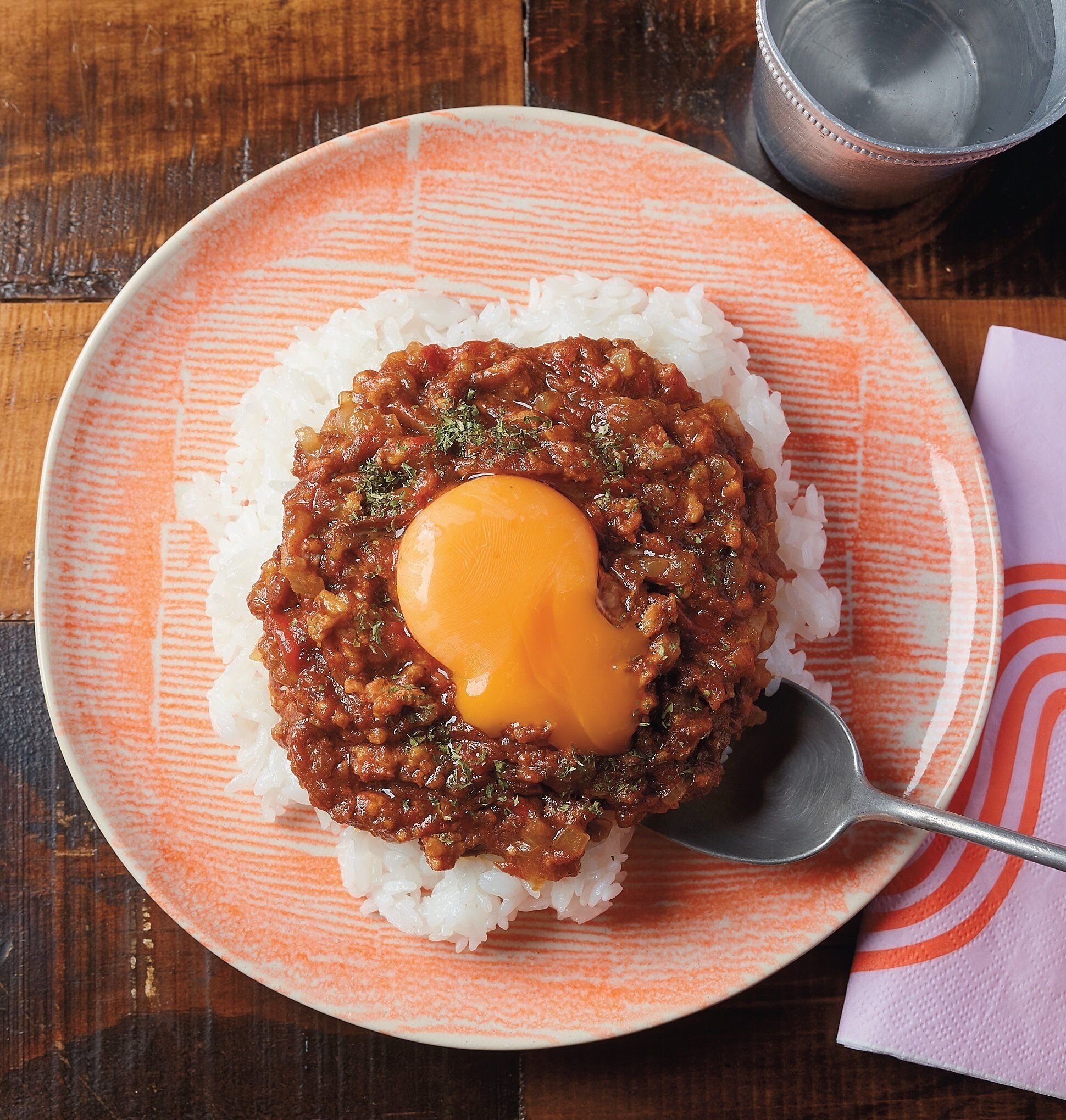 ふんわりとラップを掛けて、電子レンジで12分加熱する。よく混ぜてご飯の上にかけ、卵黄をのせ、好みでドライパセリを散らす。