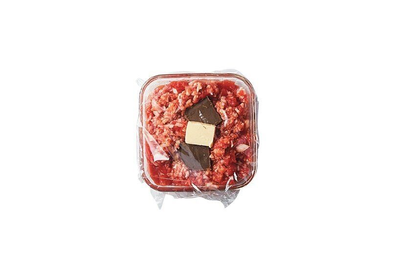 耐熱容器にみじん切りにした玉ねぎ、トマト缶、ひき肉、[A]を入れてよく混ぜ、カレールウとバターを埋め込む。