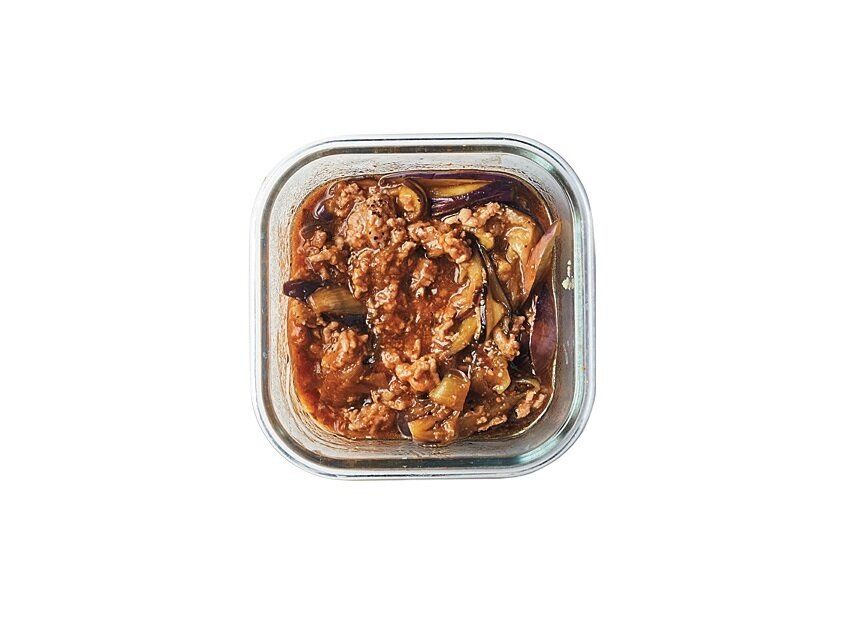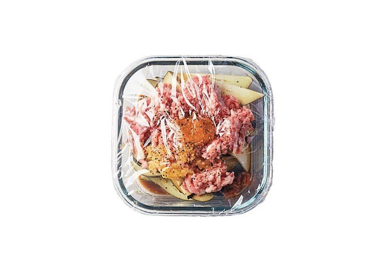 なすは縦半分に切り、1cm幅の細切りにして耐熱容器に入れる。[A]を加え、ひき肉をのせて黒こしょうをふる。ふんわりとラップを掛けて、電子レンジで5分加熱する。