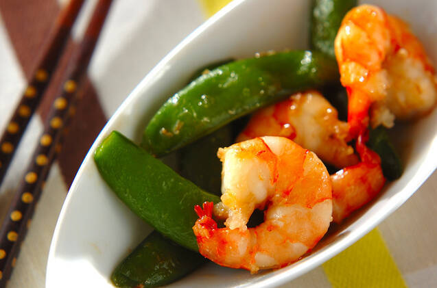 エビとスナップエンドウを使って、オイスターソースなどで味付けすれば中華炒めが作れます。