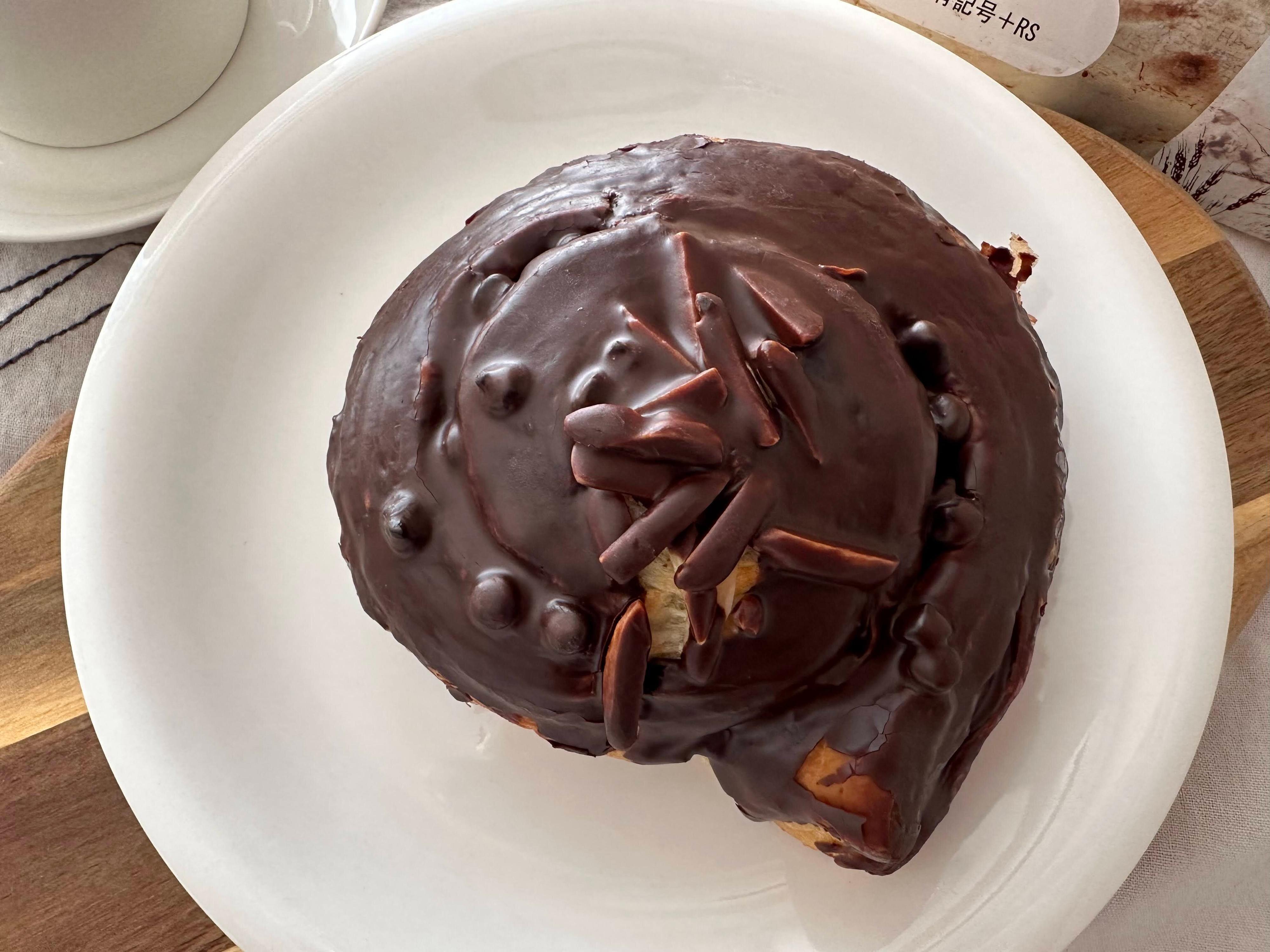 渦巻き状のデニッシュにはたっぷりとチョコレートがコーティングされています。チョコレートに隠れていますが、デニッシュのトップにはアーモンドもトッピングされており、ボリュームたっぷりのビジュアルはとにかく圧巻…!