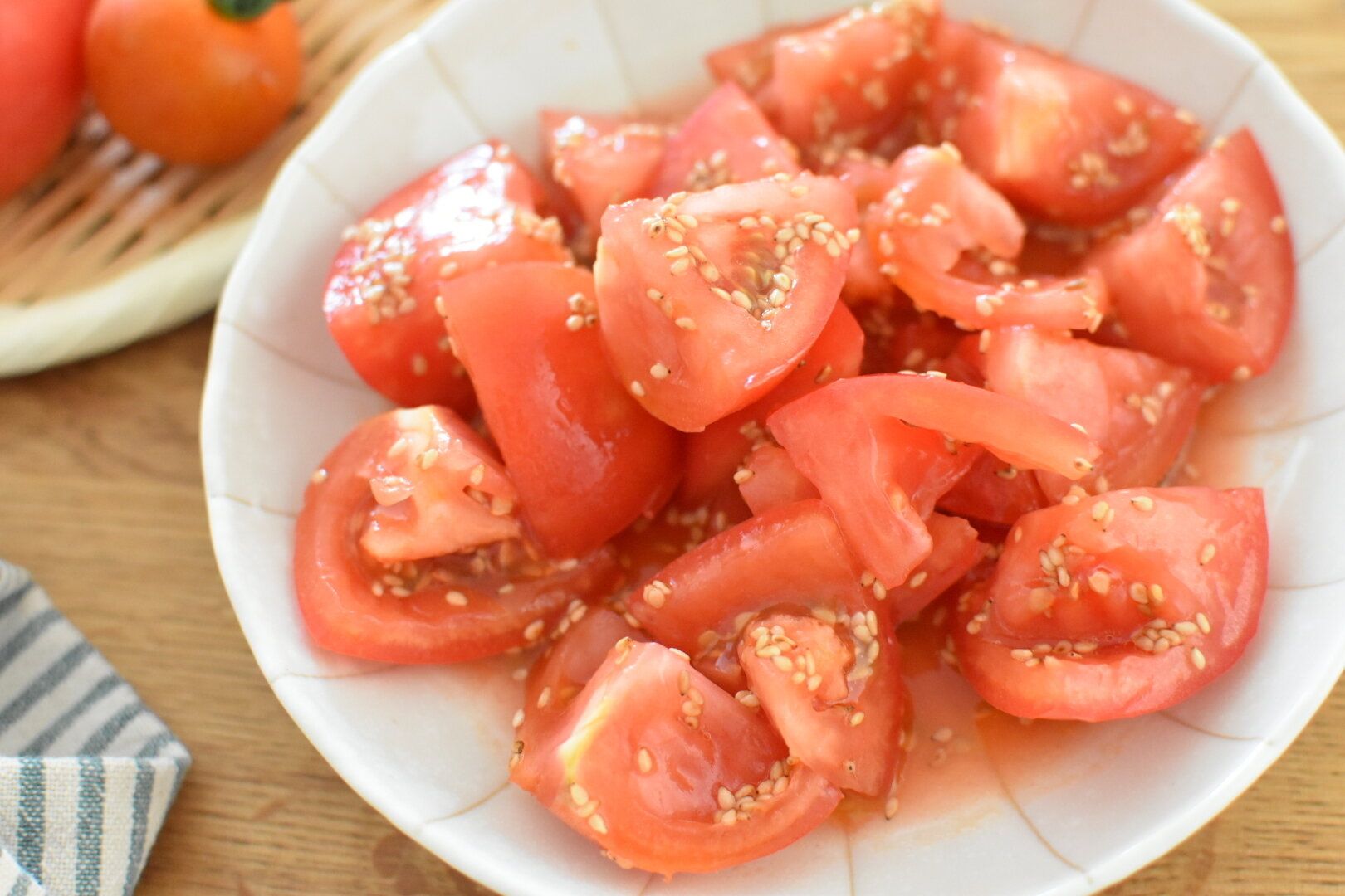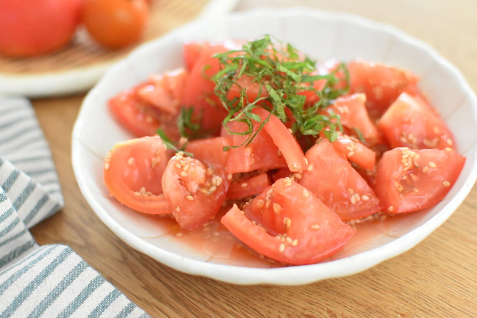 大葉のさわやかな風味とごまの香ばしさが、トマトのおいしさを引き立ててくれます。トマトの酸味が味のアクセントになって、いくらでも食べられそうな味わいに仕上がりました。