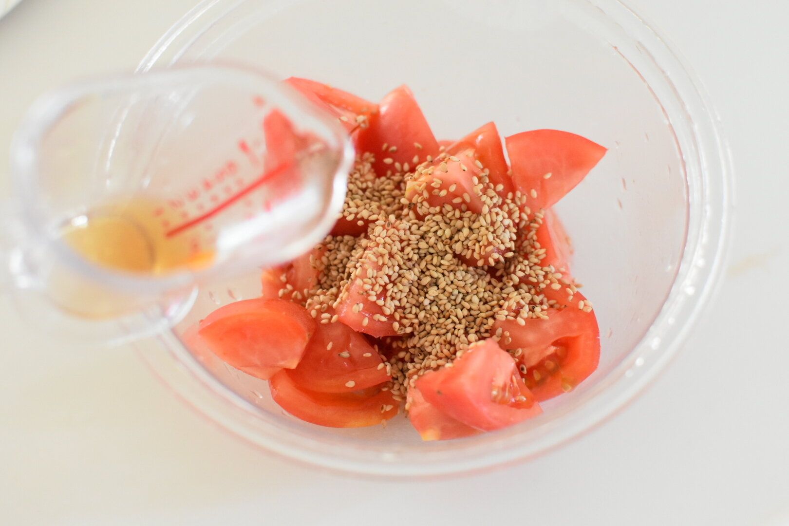 1.トマトはサイコロ状にカットし、ボウルにいれる。白ごま、白だし、ごま油を加えて全体をよく混ぜ合わせる
