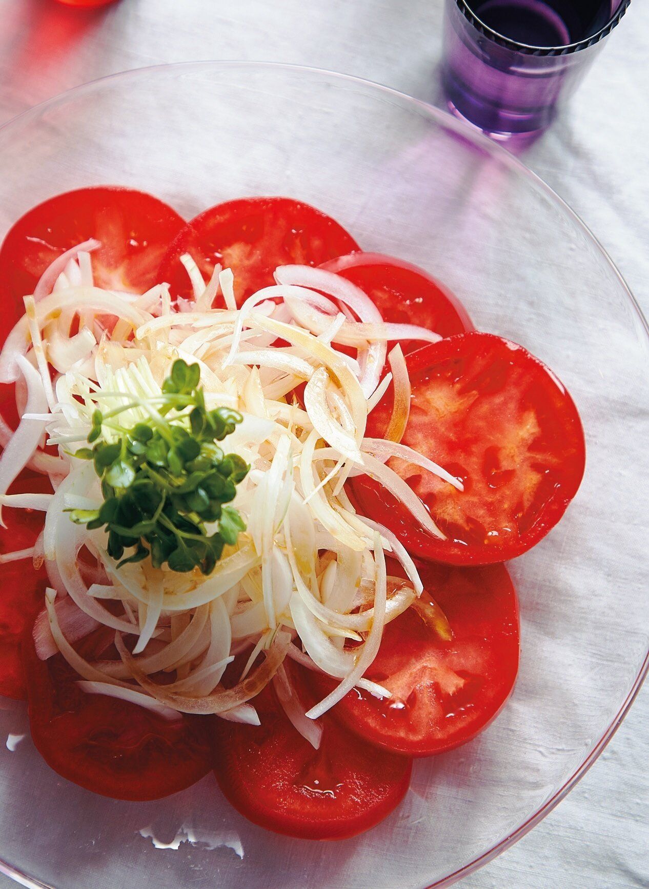 トマトの輪切り2個分を器に盛り、さらし玉ねぎ1/4個分、貝割れ菜適量をのせて、めんつゆ大さじ1、(好みで)ごま油小さじ1を回しかける。