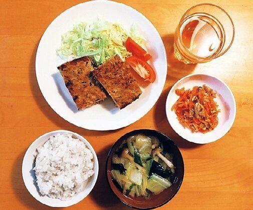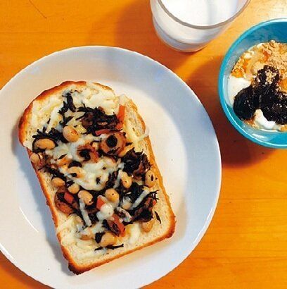朝食でよく作るのが、総菜のっけトースト。前の晩に作ったひじきや切り干し大根の煮もの、きんぴらなどを食パンにのっけてピザ用チーズを散らして焼くだけ。「和のおかずも意外にイケちゃうロスゼロメニューです!」。