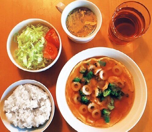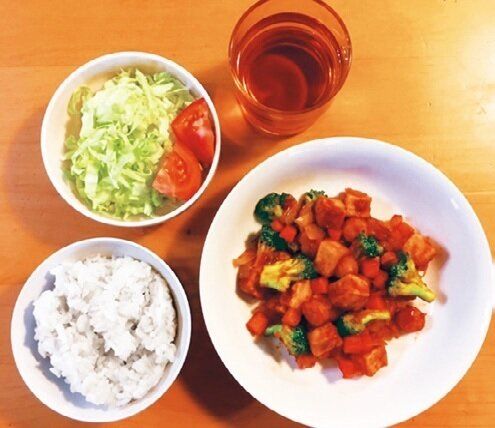 ●高野豆腐と野菜のケチャップ煮(高野豆腐、ソーセージ、玉ねぎ、にんじん、ブロッコリーを炒めて、ケチャップで味つけ)
