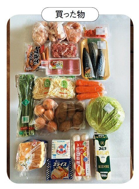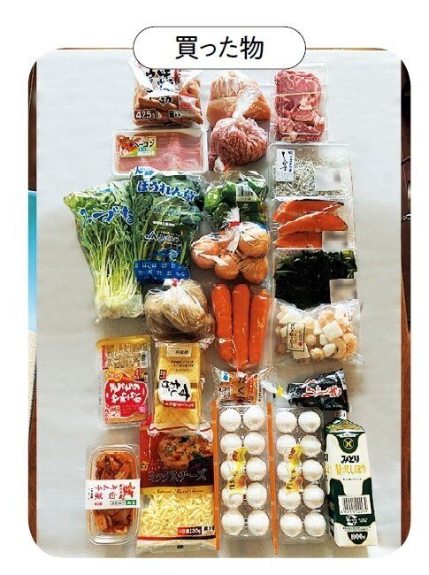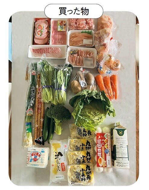 肉は、特売品の鶏胸肉をはじめ、使い勝手のよい豚こま切れ肉などを。野菜はボリュームのある旬のキャベツとにらなどを購入。