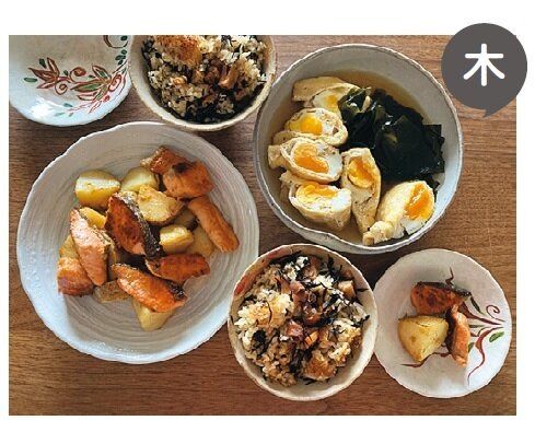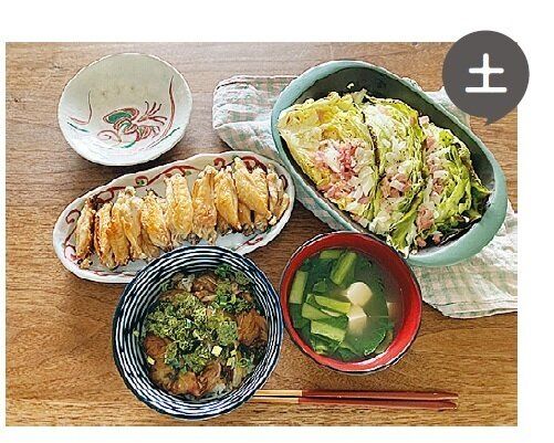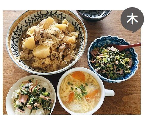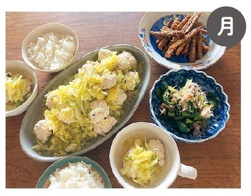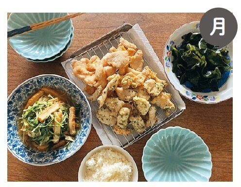しなしなになりやすい小松菜は土曜日に一気にゆで、汁もの、おひたし、炒めものに利用。同様に、ごぼうは月曜日にから揚げを作ったついでに金曜日のきんぴらも作ってしまい、食べ残しも手間もナシ。