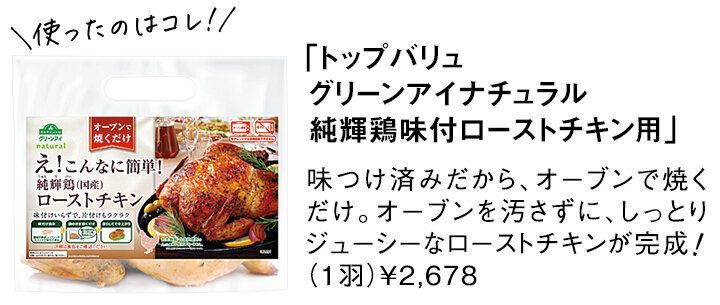 1「トップバリュ グリーンアイナチュラル 純輝鶏味付ローストチキン用」1個を内袋のまま天板にのせる。200℃(予熱なし)のオーブンで約60分焼く。