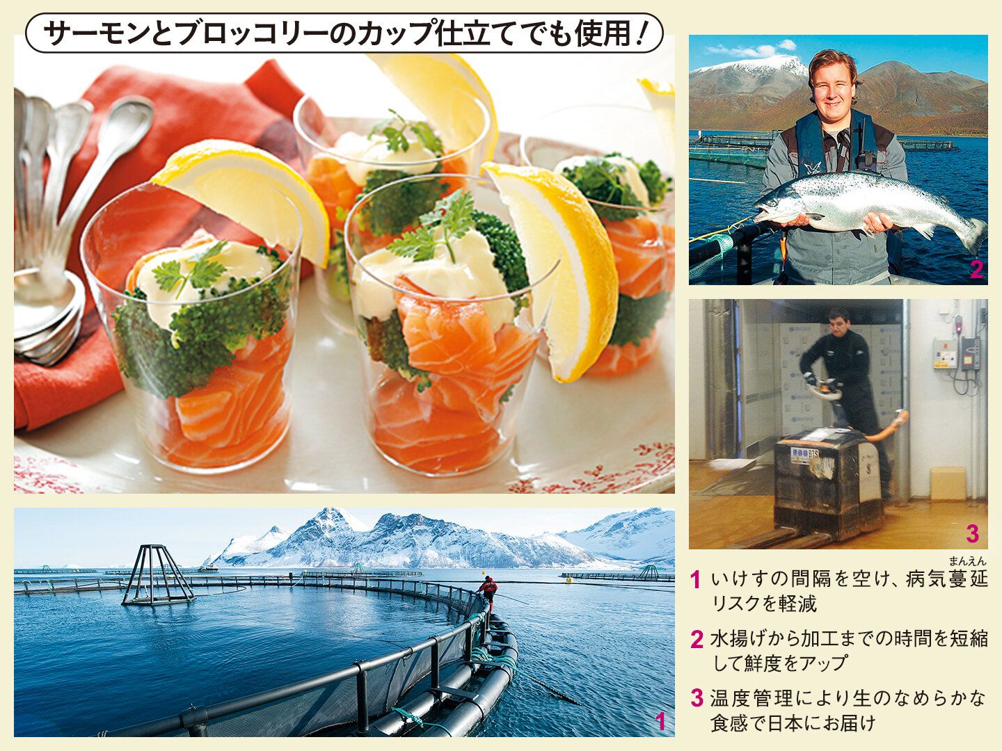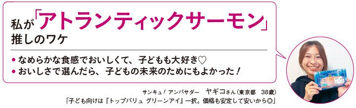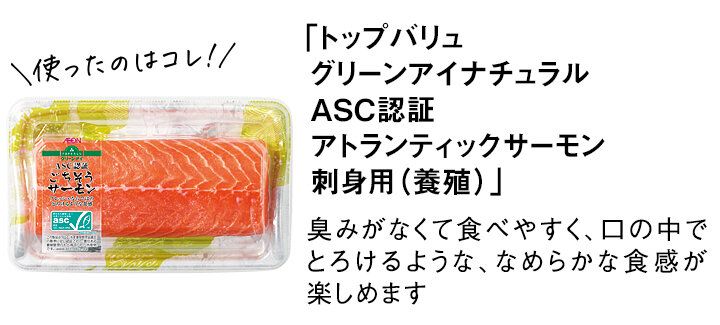 「アトランティックサーモンの中でも、ノルウェー北部の特に海水温が低い地域でゆっくりと成長するため、脂がのって身の締まったサーモンに育ちます。安全・安心のことを考えて、抗生物質は使用していません。鮮度やおいしさを保つために、一度も凍らせずに生のまま、日本に空輸で届けています」(イオントップバリュ 水産商品部 山部浩二さん)