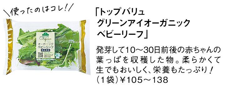 3 2を丸い器に盛って皿の中央に置き、まわりに「トップバリュ グリーンアイオーガニック ベビーリーフ」2袋を盛りつける。1をベビーリーフの上にトッピングする。