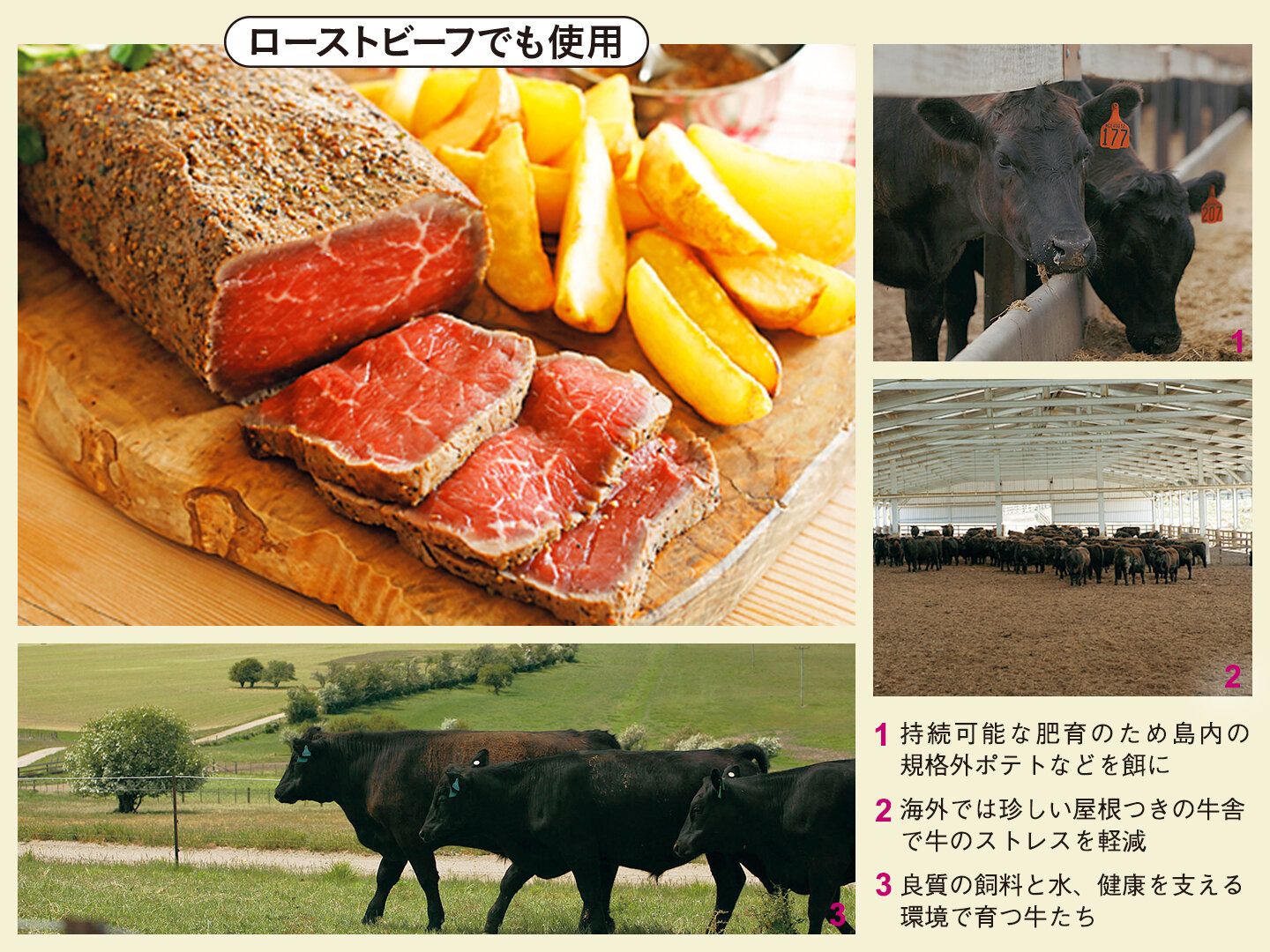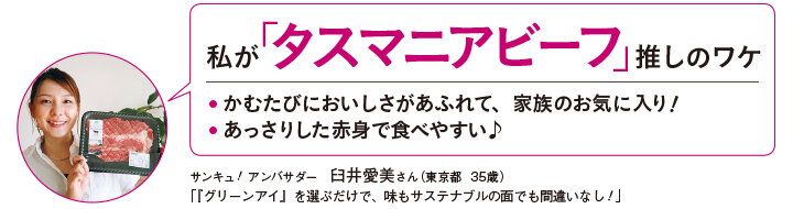 「1974年に強い想いを実現するために広大な大自然を有するタスマニア島にわたりました。成長ホルモン剤、抗生物質は使用せず、牛へのストレスやケガを減らす努力や環境への配慮をしながら育てています。安全・安心なおいしい牛肉を召し上がってください」(イオントップバリュ 畜産商品部 永井宏正さん)