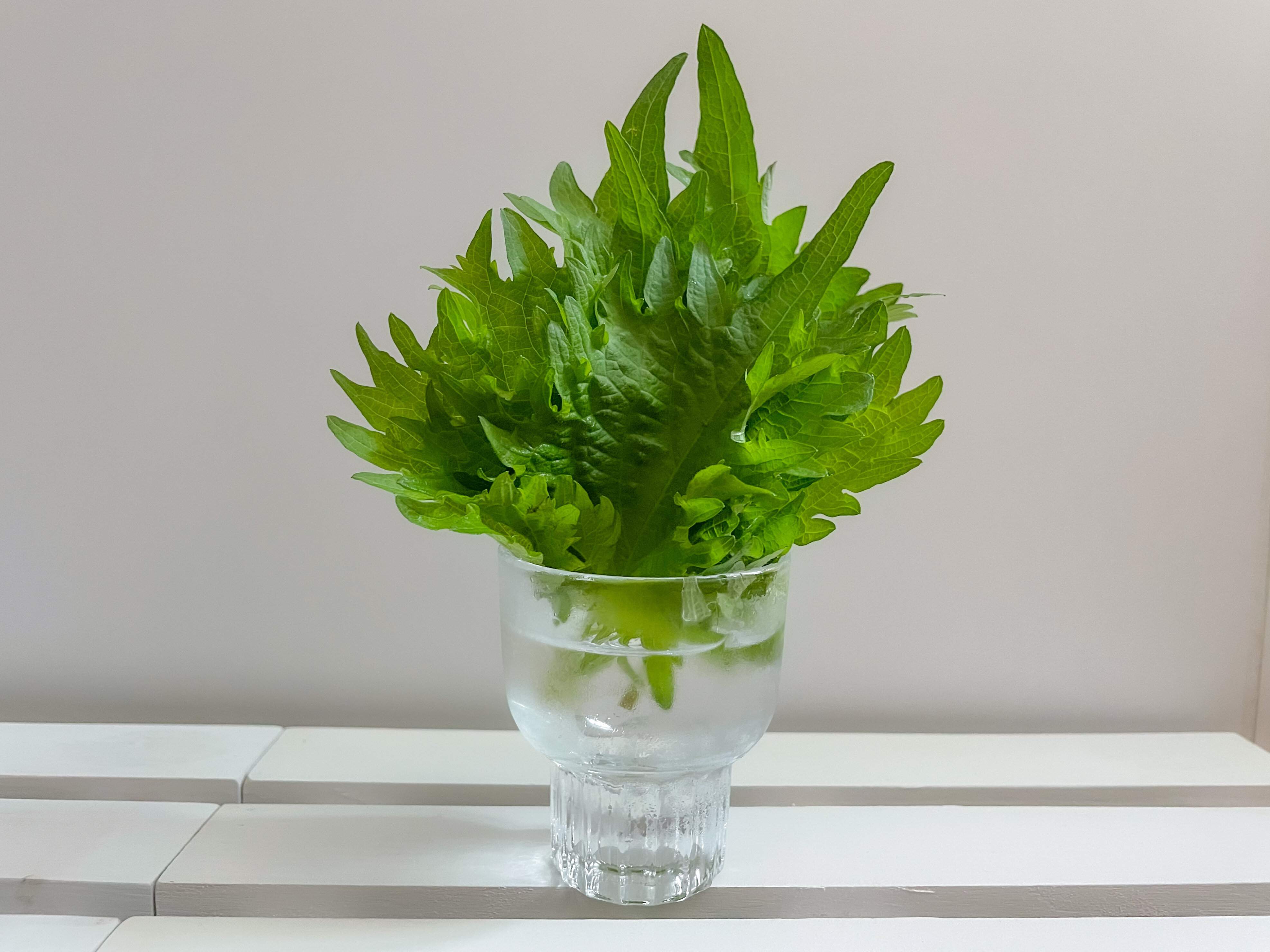 こちらの画像の大葉は、ご紹介の方法で2週間保存しておいたもの。たったこれだけで、葉先までシャキッとみずみずしさがしっかりとキープされています。