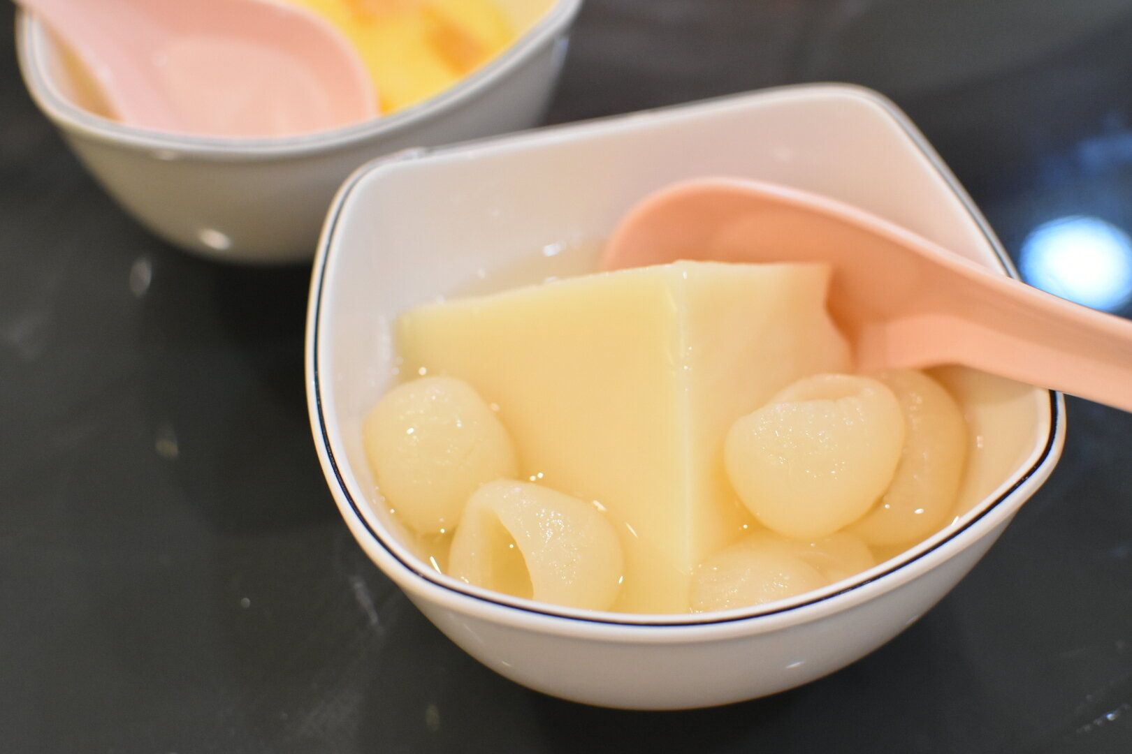 こちらの豆腐花は寒天を使って固めていて、豆乳と相性抜群の黒ごまソースを添えていただきます。