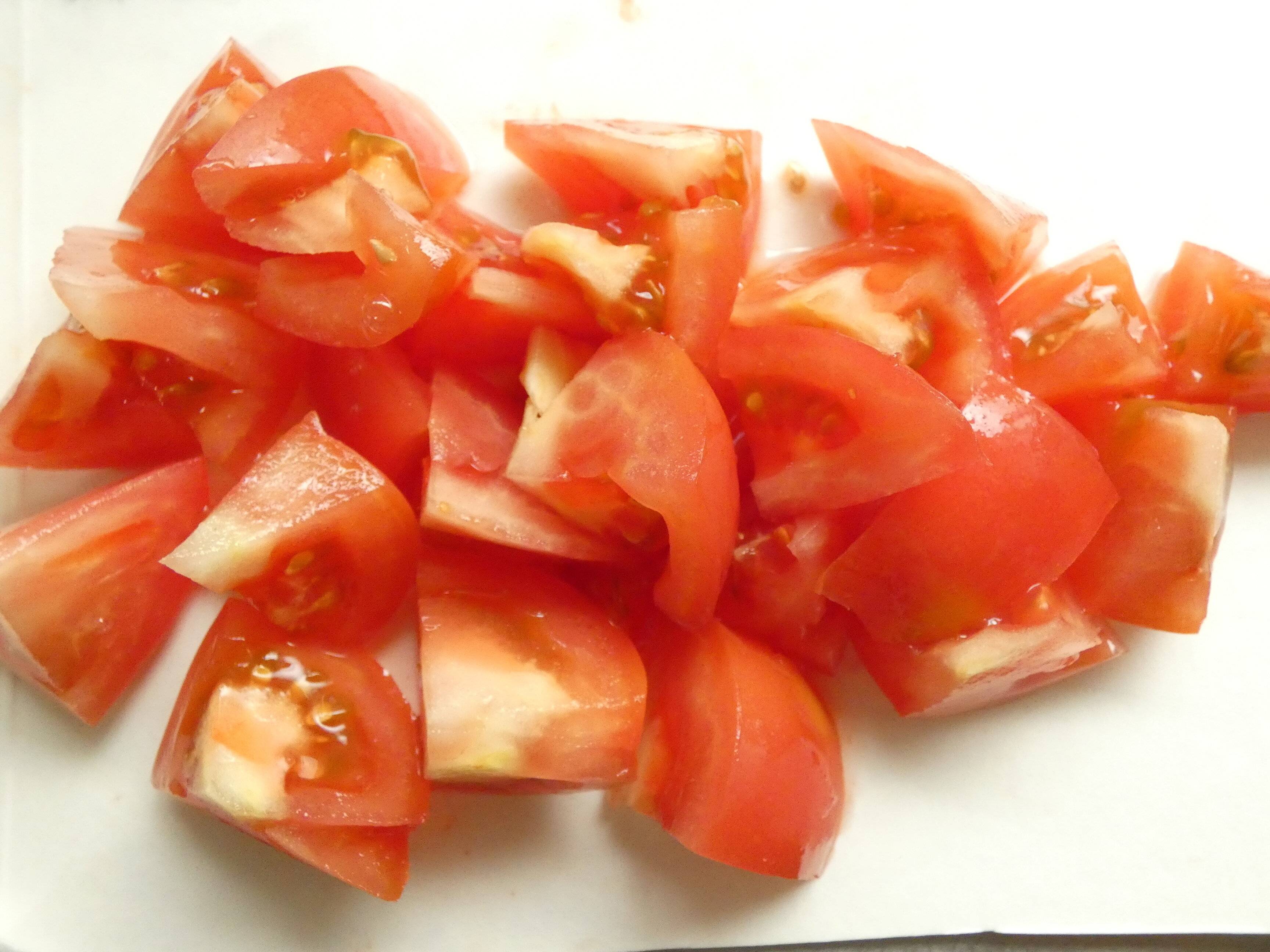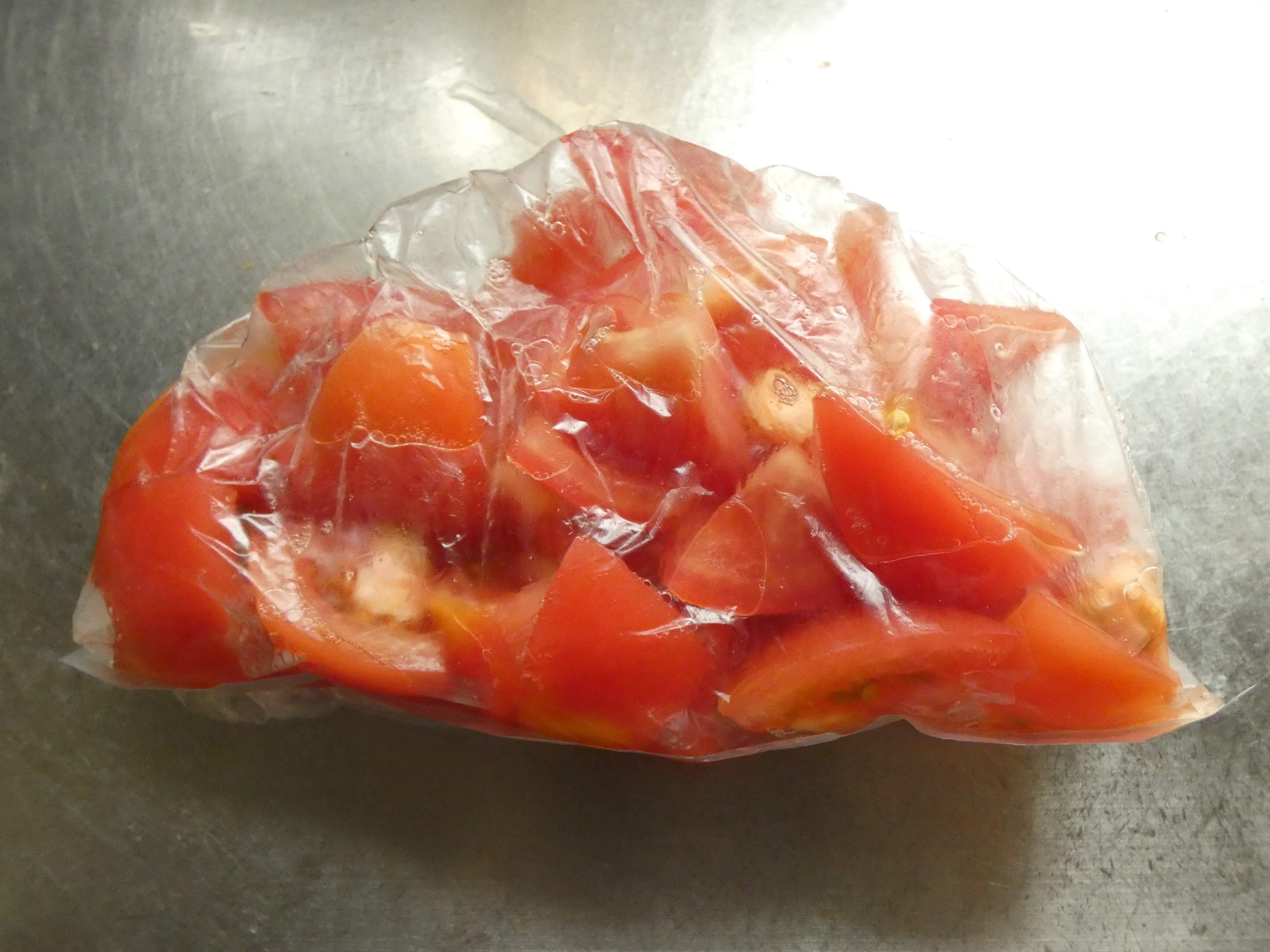 トマトを一口大に切り、すし酢と一緒にポリ袋へ入れます。15分くらいつけておけばOK。さっぱりとした1品があっという間に完成します。