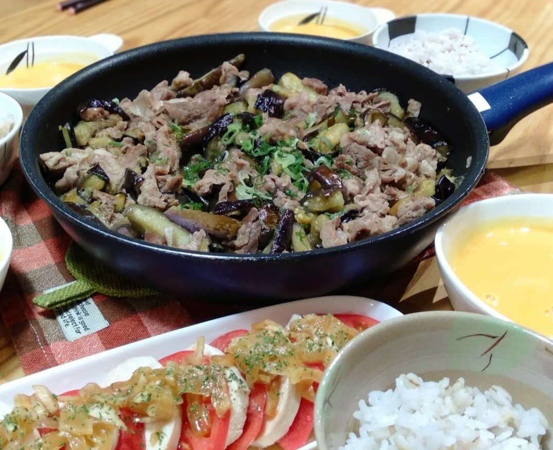 ナスを使い、特売の豚こま肉を多めに組み合わせてメイン料理に。