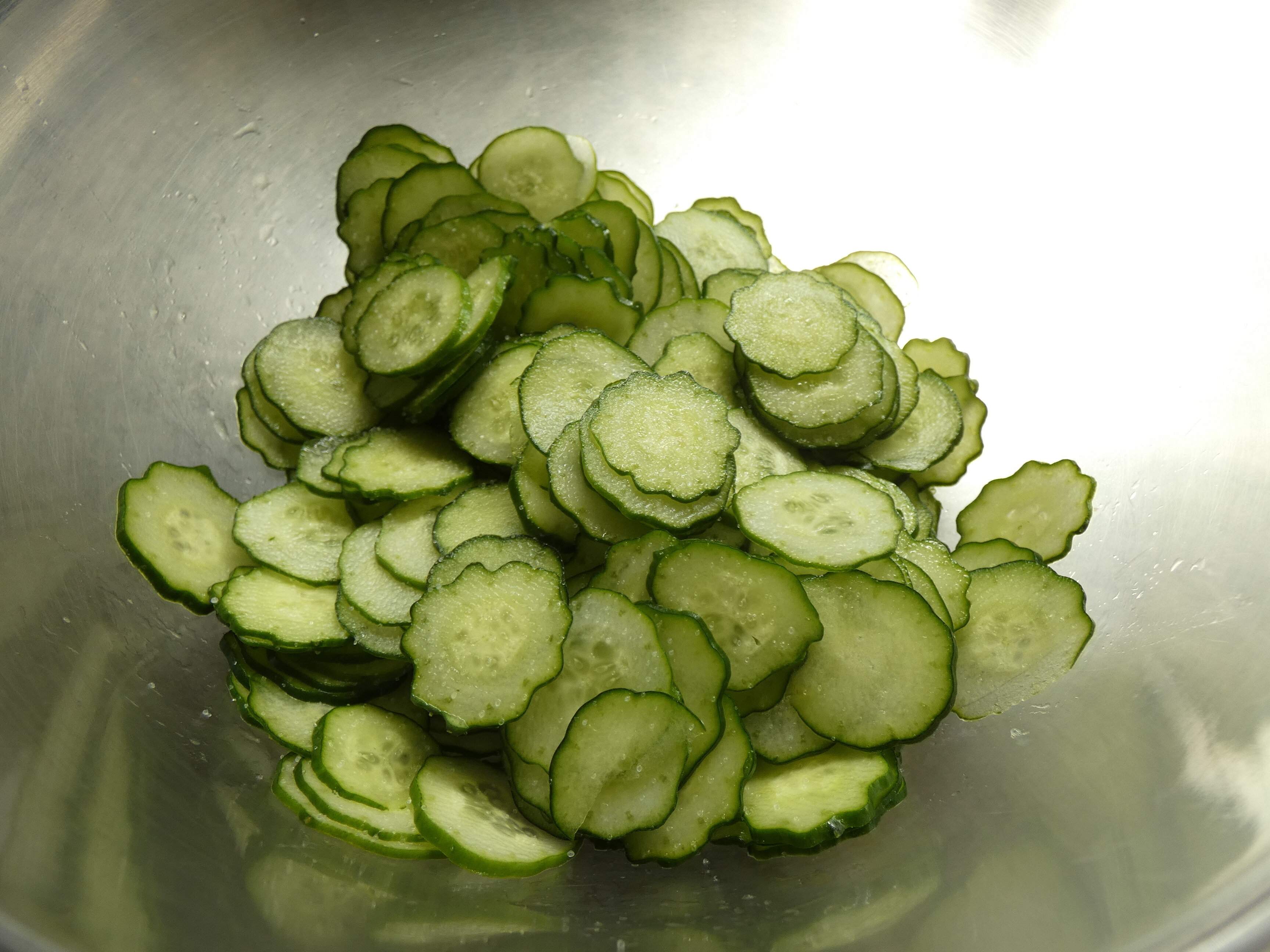 キュウリを薄切りにして塩もみをします。これだけで余分な水分が抜けるので冷凍保存が可能になるんです。